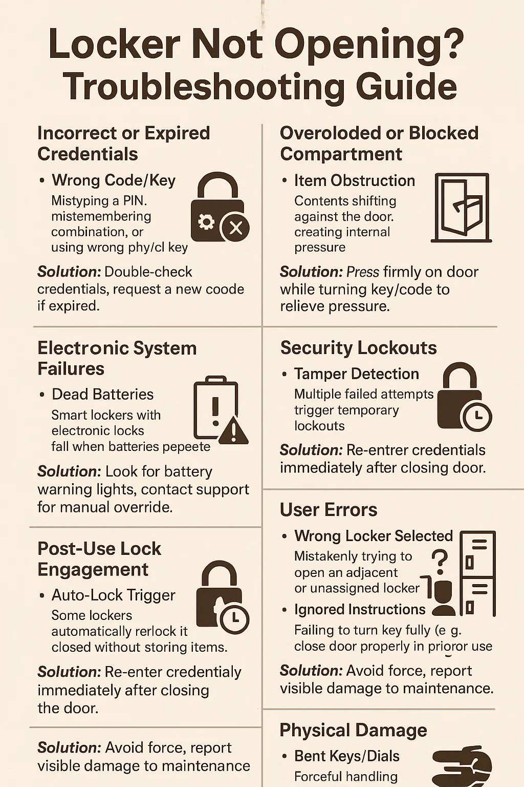 Sau đây là bảng phân tích các lý do phổ biến khiến tủ đựng đồ có thể không mở được, cùng với các bước khắc phục sự cố thực tế: